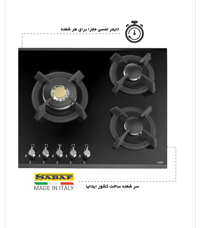 ویژگی بارز : مجهز به شعله ی زمان دار برای هر شعله با قطع کن اتومات و صفحه کنترل لمسی